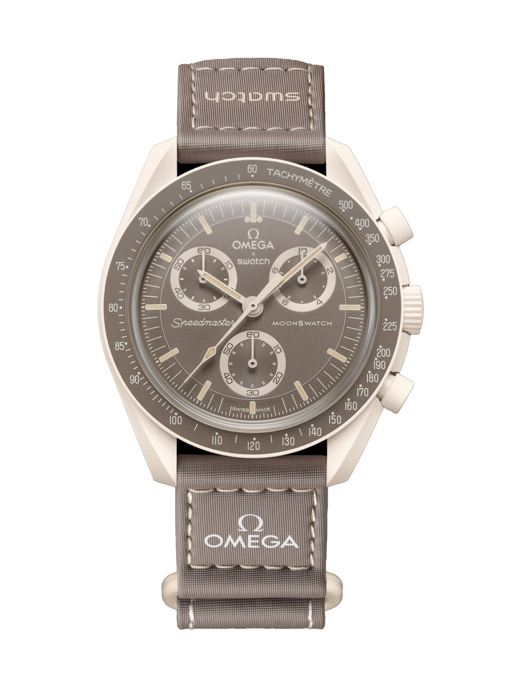 The subdials feature Arabic numerals and indexes in a radial format, as a nod to the Speedmaster Alaska II and III projects. The greige (taupe) bezel is adorned with a sand-colored tachymeter scale. All dials in the collection carry the OMEGA X Swatch branding, the iconic Speedmaster logo and MoonSwatch logo.