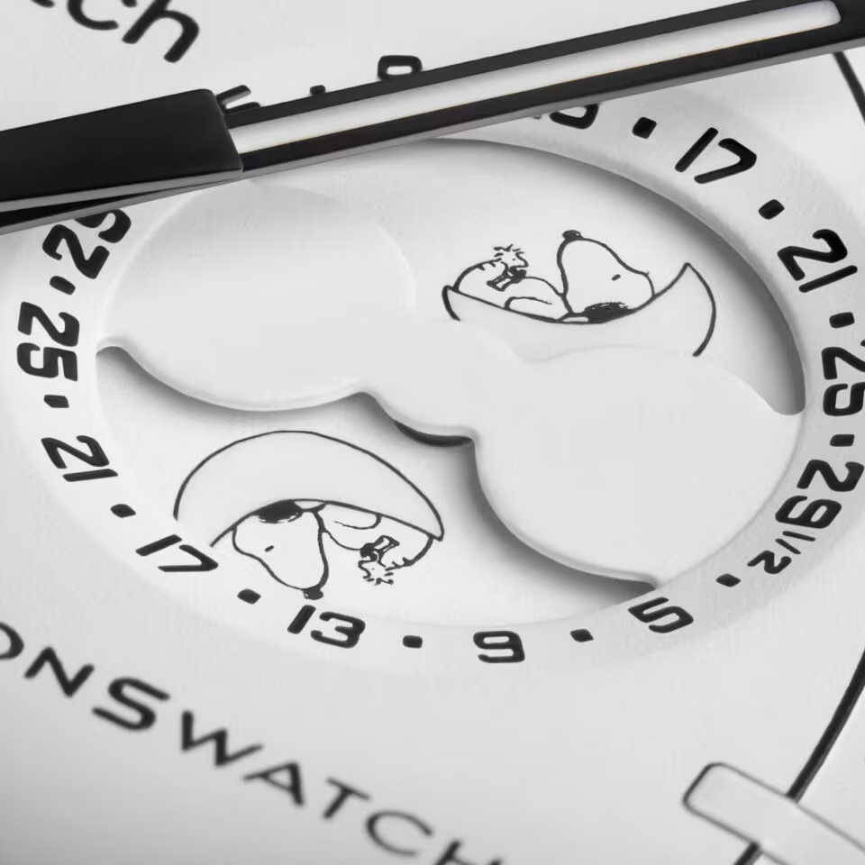 The subdials and bezel are in white. This model stands out with its moon phase function, arguably the most poetic of all watch complications. Snoopy who has been associated with human space missions since the 1960s, is featured lying on the moon on the moon phase disc, which rotates in the subdial set at 2 o’clock.