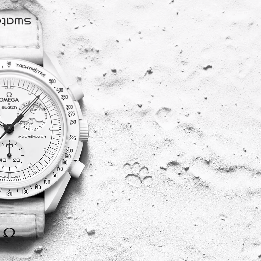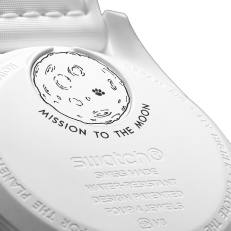 All dials in the collection carry the OMEGA X Swatch branding, the iconic Speedmaster logo and the MoonSwatch logo. The box-shaped biosourced glass construction, the etched "S" in the center of the glass referencing the Swatch logo, the fine and sophisticated circular pattern on the dial outer ring and the recessed subdials, the sharp and smooth lugs construction, the iconic “dot over 90” detail on the tachymeter scale and of course the unique Bioceramic feel are common to all models. The indexes, hour and minute hands and chronograph seconds hand sport Grade A Super-LumiNova® for a perfect glow in the dark.