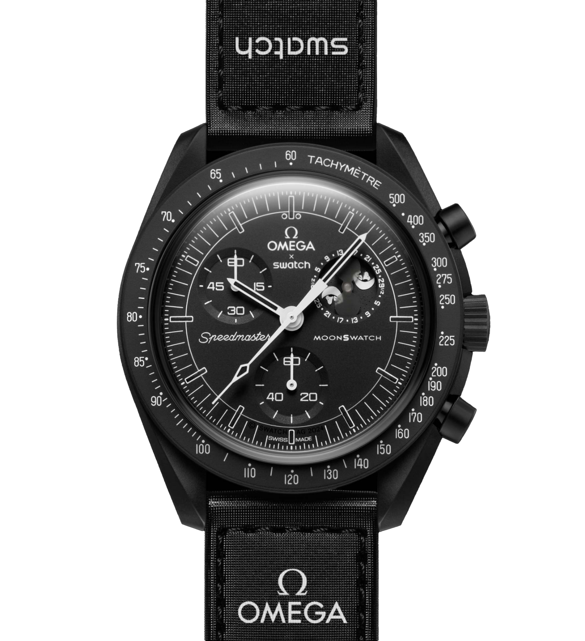 Aptly named “NEW MOON”, this limited model boasts an elegant all-black color scheme. It features a Bioceramic case, crown and pushers as well as a VELCRO® strap. The chronograph seconds hand, subdial hands, and tachymeter scale are in white.
