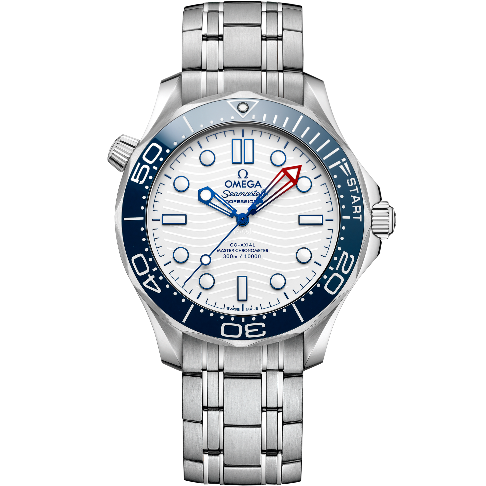 The 42 mm Seamaster Diver 300M in stainless steel has a blue ceramic unidirectional bezel with a regatta scale, comprised of two 5-minute pre-start sections, and START section with regatta-inspired flag.